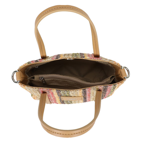 Denna snygga stråväska är designad för dig som vill ha en lätt, stilfull och funktionell väska under varmare dagar. Väskans huvudfack öppnas smidigt med magnetknapp, vilket gör den både praktisk och säker i vardagen.